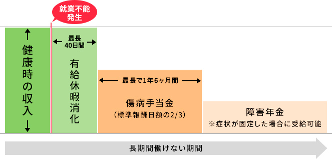もしも、休業を余儀なくされたとき、会社勤めの方には、有給休暇制度があります。長期休業になる場合は、公的保証として傷病手当金があります。