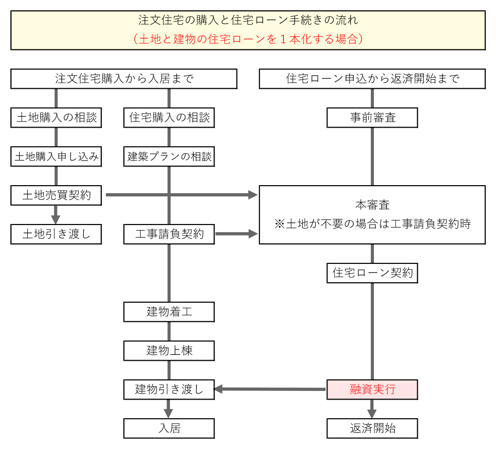 住宅ローンを使って注文住宅の建てる際の流れは住宅ローンの組み方によっても変わりますが、今回の記事では、土地の購入代金と住宅建築費の住宅ローンを一本化する場合と、別々で住宅ローンを組む二本化する場合の2パターンの流れ、つなぎ融資についてご紹介します。