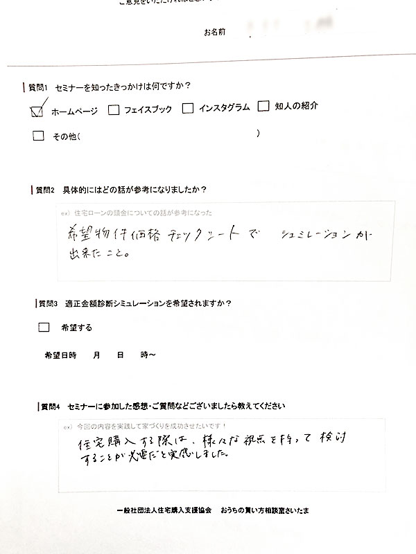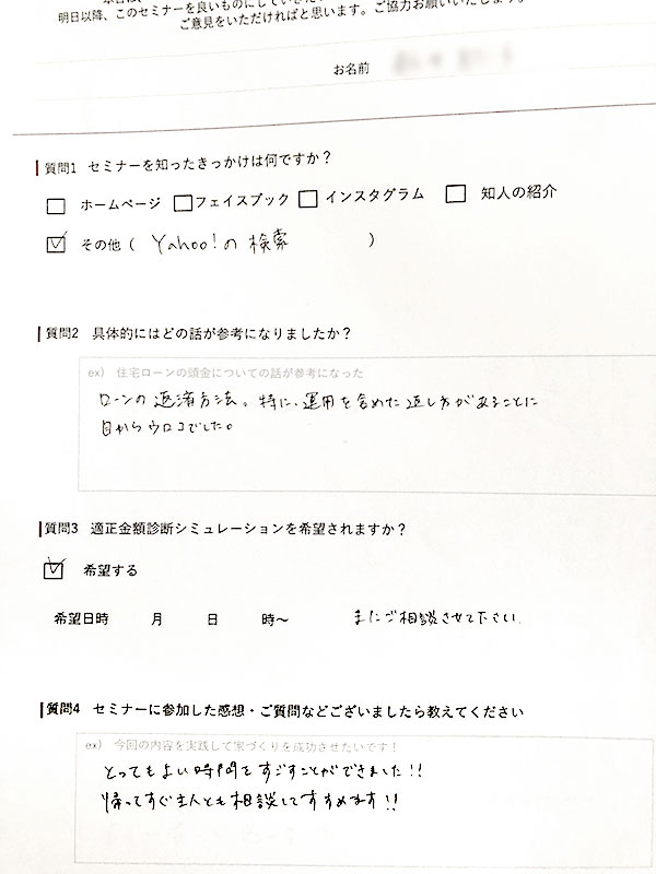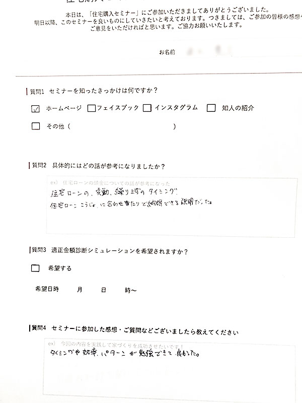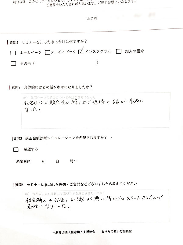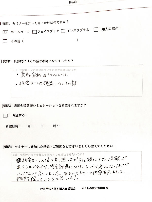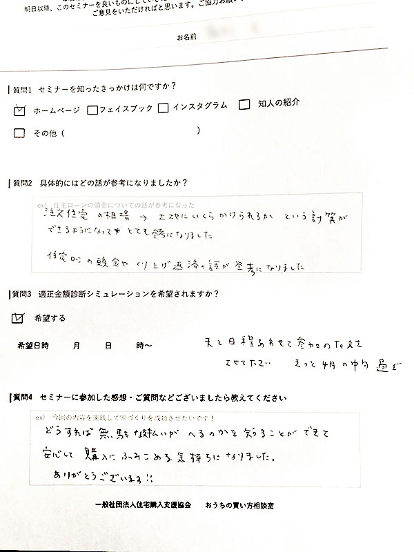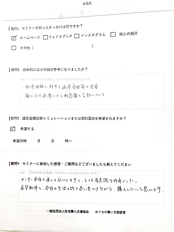 - セミナー全体を通して分かりやすく、とても有意義な時間でした。希望物件と、今後の生活の折り合いをつけながら、購入したいと思います。